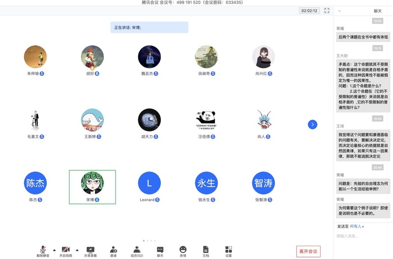2020年5月16日19:00-22:00,第166期“爱智求真读书会”活动在腾讯会议线上平台举行。本期读书会的主题是“先验理念的第三个冲突”,研读的文本是康德的《纯粹理性批判》(2004年版)。本次读书会采取线上进行,多人领读模式,由胡好老师主持,西北师范大学王炜和尚兴红同学领读。清华大学、中国人民大学、华中科技大学等其他高校的师生参与了本次活动。
