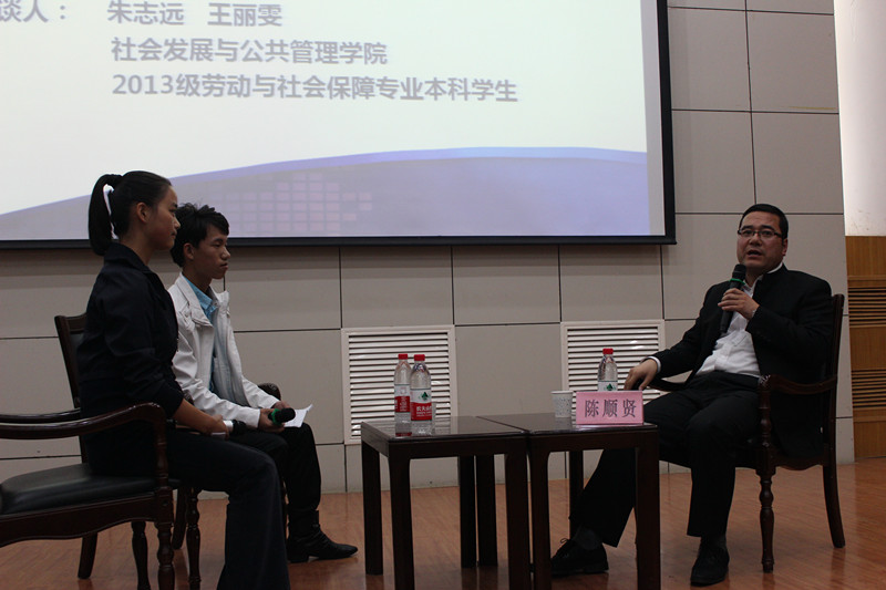 2013级劳动与社会保障专业本科学生王丽雯、朱志远就自我创业的话题对陈顺贤董事长进行了职业人物生涯访谈。在访谈过程中,陈顺贤董事长就同学们提出的问题,结合自身的真实经历,为大家讲解了他对创业若干问题的理解和认识,加深了在场师生对自我创业这个就业途径的认识。讲座正式开始后,陈顺贤董事长以“创业者的八大修炼”为主题,从“敢”、“状态”、“相信自我”、“有强烈的企图心”、“专业”、“学习”、“珍惜时间”、“观念”等八个方面,详细讲解了创业者应具备的基本素质。在讲座中,陈顺贤董事长富有激情、幽默风趣、紧密联系生活的讲解,赢得了鲸鱼体育直播