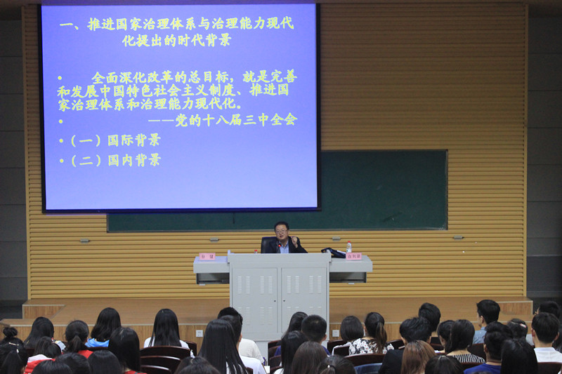 5月5日晚,鲸鱼体育直播 副院长孙健教授于新校区第一报告厅作“推进国家治理体系与治理能力现代化”报告,鲸鱼体育直播 行政管理系主任白列湖博士及鲸鱼直播 部分本科生、研究生参加此次报告会。
