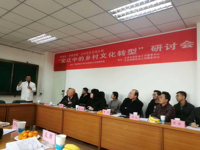 2017年12月23日,由社会发展与公共管理鲸鱼直播 主办,甘肃沐润社会工作服务中心、兰州创晖社会工作服务中心联合协办的“变迁中的乡村文化转型”研讨会在西北师范大学教学10号楼D区503举行,关注乡村文化转型的高校教授、农民代表、诗人、艺术家、社会组织、基金会代表与鲸鱼体育直播 研究生等三十余人参会。