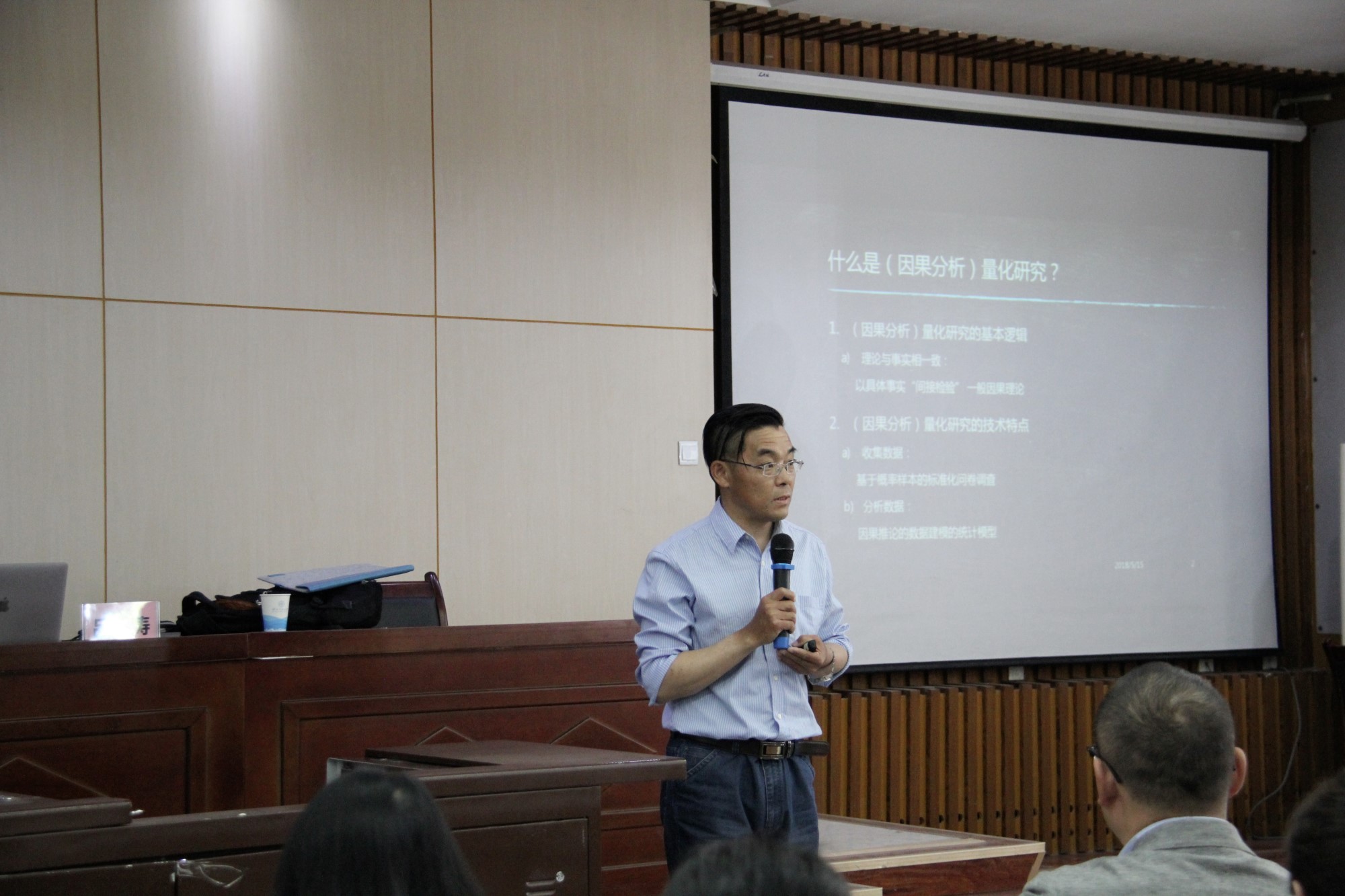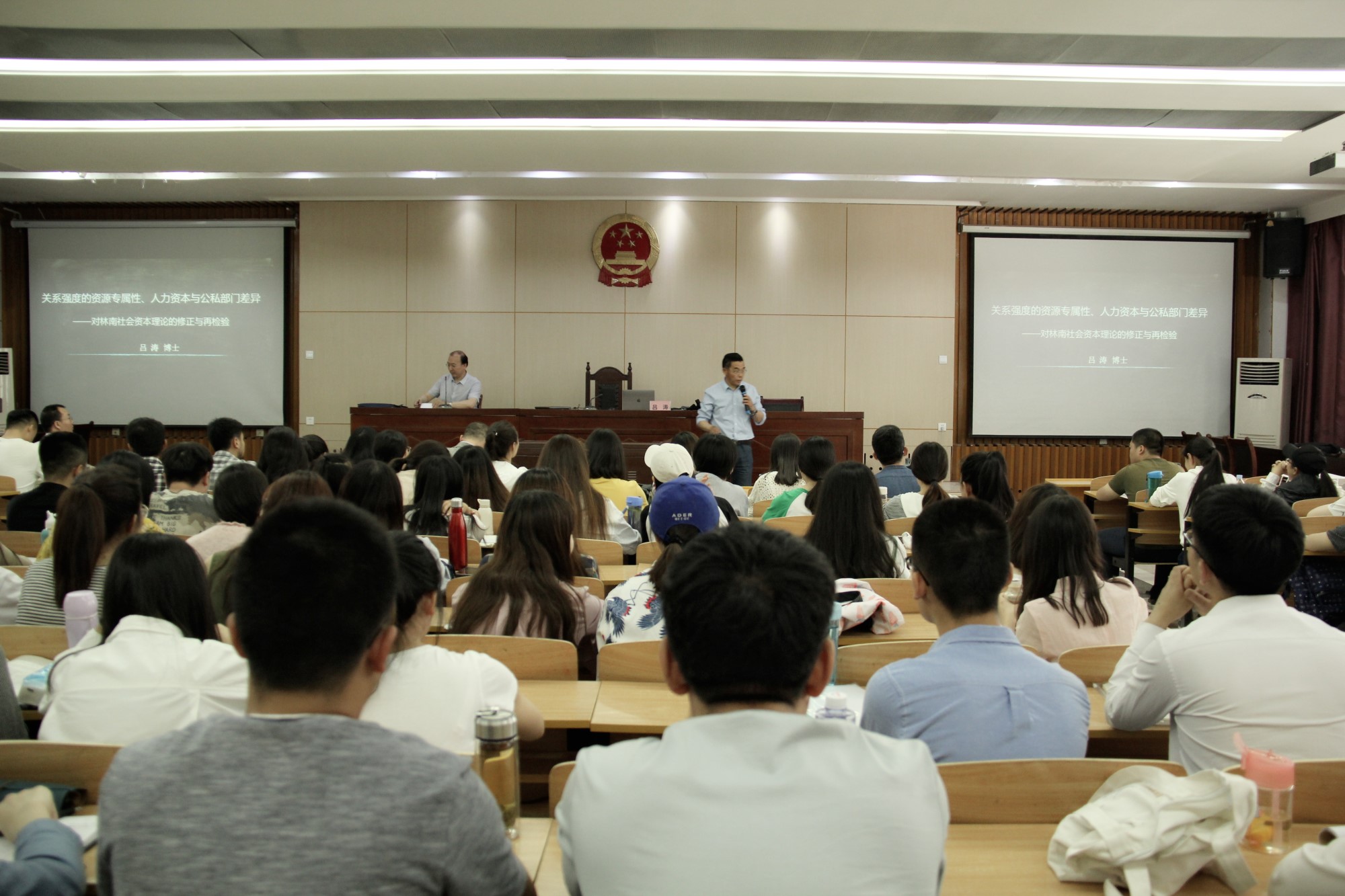 2018年5月15日下午,社会发展与公共管理鲸鱼直播 邀请社会学量化研究领域知名学者吕涛副教授在10号教学楼D区模拟法庭举行了“关于强度的资源专属性、人力资本与公司部门差异——对林南社会资本理论的修正与再检验”的讲座。讲座由鲸鱼体育直播 李怀教授主持,全院师生踊跃参加。