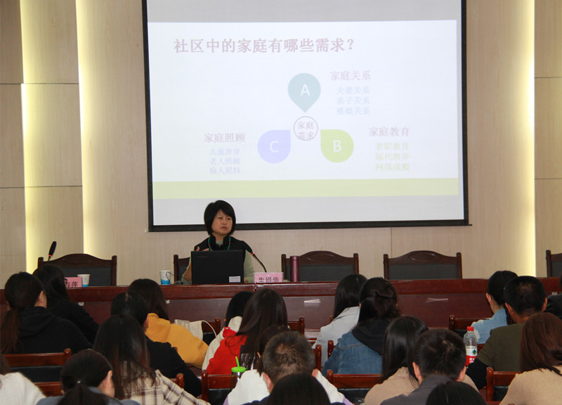 讲座中,朱眉华教授以2009年亲历的家庭服务项目为案例引入社区中的家庭需求,表示家庭关系、家庭照顾与家庭教育为社区家庭的三大需求,其中家庭关系层面具体为夫妻、亲子、婆媳关系;家庭照顾层面细化为儿童养育、老人照顾和病人照料;家庭教育譬如亲职教育、隔代教养、网络成瘾等,三大需求的细致化与具象化突出强调家庭社工在关系层面对社会相容度的调试以及社会资源的整合基于家庭需求的重要性。随后,朱教授从专业角度出发,详细讲述了家庭服务项目中社工案例的见闻与心得,总结到,原生家庭环境与个人成长的互动关系亦步亦趋,不良互动造成的童年阴影会随着个人成长渐渐放大,加之家庭环境的压制与祖辈性格的影响,家庭矛盾持续激化。但是在社工的努力与帮助下,家庭关系最终可以得到良性调整。所以社会工作者的积极作为不仅加速了“小家庭,大社会”的架构建设,也催化了家庭内部的有效沟通与冲突化解。朱教授强调无论妇联传统优势的发挥还是社工专业优势的施展,构建转借平台,加强社工人员培训与开发,深化社会工作的回应性与互助性已逐渐成为社会工作的实质追求。