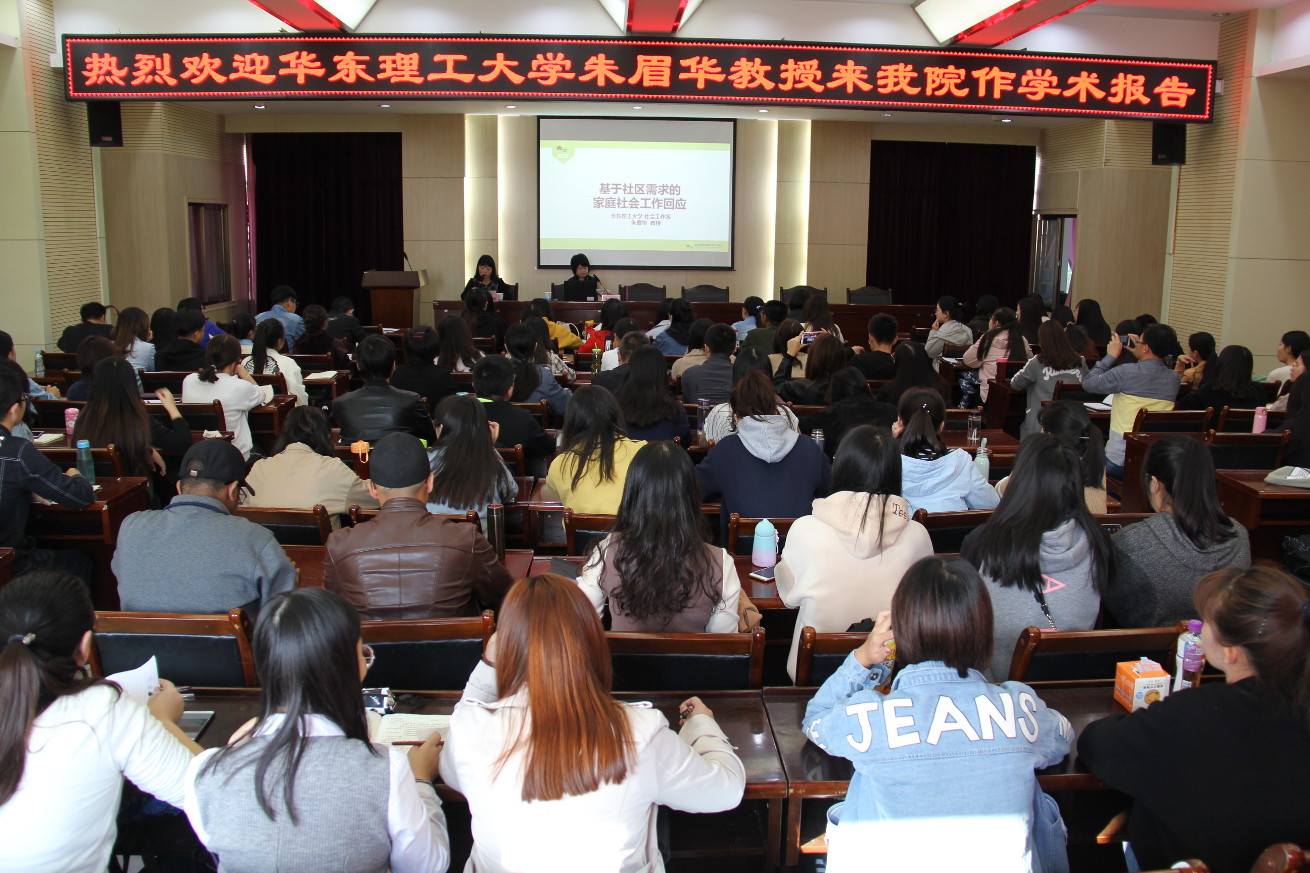 2018年10月12日下午,应鲸鱼体育直播 邀请,华东理工大学朱眉华教授在10号教学楼D区四楼报告厅作主题为“基于社区需求的家庭社会工作回应”的学术报告,讲座由鲸鱼体育直播 社会工作系陆春萍教授主持,来自本校与外校社会工作专业学习者、爱好者齐聚十教四楼报告厅近200人共同学习。