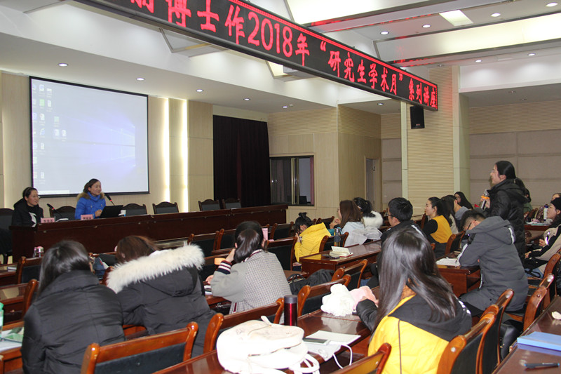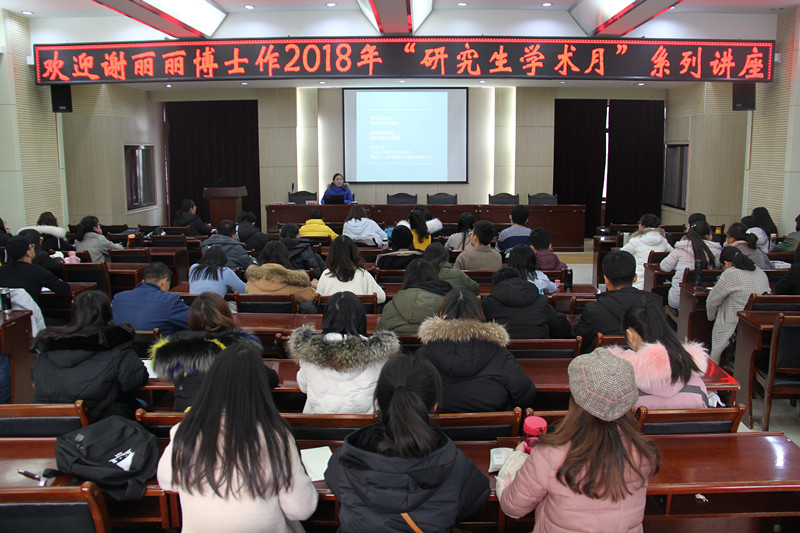 2018年12月14日下午,鲸鱼体育直播 在10号教学楼四楼报告厅开展2018年“研究生学术月”系列讲座,青年教师谢丽丽博士作“学位论文的选题和实地调查”的学术讲座。鲸鱼体育直播 全日制研究生约120人参加聆听了这场学术报告,报告由李秀英副教授主持。
