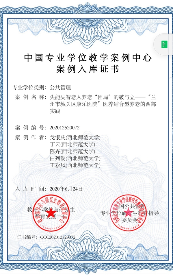 中国公共管理专业学位教学案例中心2019年度教学案例入库评审结果公布,鲸鱼体育直播 戈银庆教授领衔的团队撰写的案例《失能失智老人养老“困局”的破与立——“兰州市城关区康乐医院”医养结合型养老的西部实践》顺利通过专家评审,成功入库中国专业学位教学案例中心。该案例以兰州市城关区康乐医院为调研对象,主要分析了老龄化过程中失能失智老人养老困局的破解问题。
