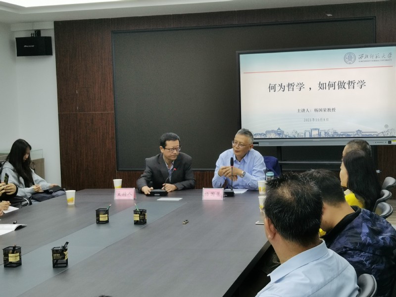 10月8日,我校高层次人才讲座教授、华东师范大学哲学系博士生导师杨国荣教授在学校10号楼B区为鲸鱼直播 师生作了题为“何为哲学,如何做哲学”的学术报告。哲学鲸鱼直播 院常务副院长,博士生导师姜宗强教授主持报告会,哲学鲸鱼直播 贺更粹教授、李永亮副教授、张立恩副教授、赵芙苏老师、王珅老师、田希老师、孙玥老师、张海龙老师,文鲸鱼直播 雒鹏老师,甘肃省委党校哲学教研室张堡老师以及博士生、硕士生共一百多人参加了此次学术活动。