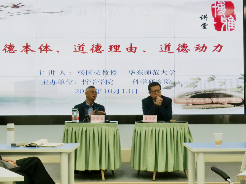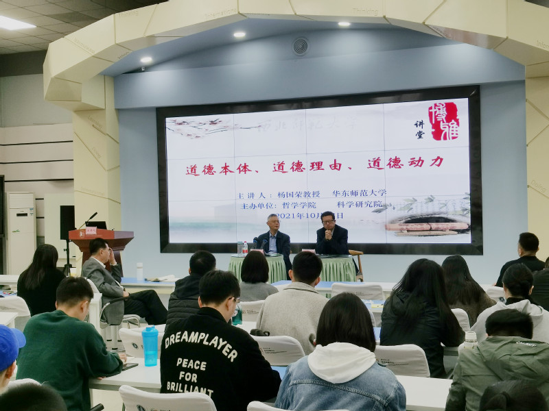 10月13日上午,我校高层次人才讲座教授、华东师范大学哲学系博士生导师杨国荣教授在学校教师发展中心为学校师生作了题为“道德本体、道德理由、道德动力”的学术报告。哲学鲸鱼直播 院常务副院长,博士生导师姜宗强教授主持报告会,省人大副主任陈克恭,哲学鲸鱼直播 党委书记李光华、贺更粹教授、张立恩副教授、张海龙老师,以及校内博士生、硕士生共一百余人参加了此次学术活动。