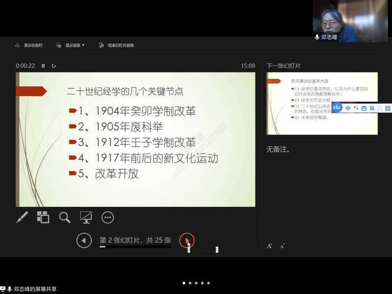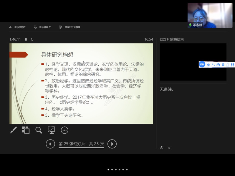 11月2日下午,应哲学鲸鱼直播 邀请,复旦大学历史系教授、博士生导师邓志峰通过线上方式为鲸鱼体育直播 师生作了题为“经学研究的回顾与前瞻”的学术报告。会议由哲学鲸鱼直播 张立恩副教授主持,鲸鱼直播 师生及校内外老师、学生共同参加了报告会。