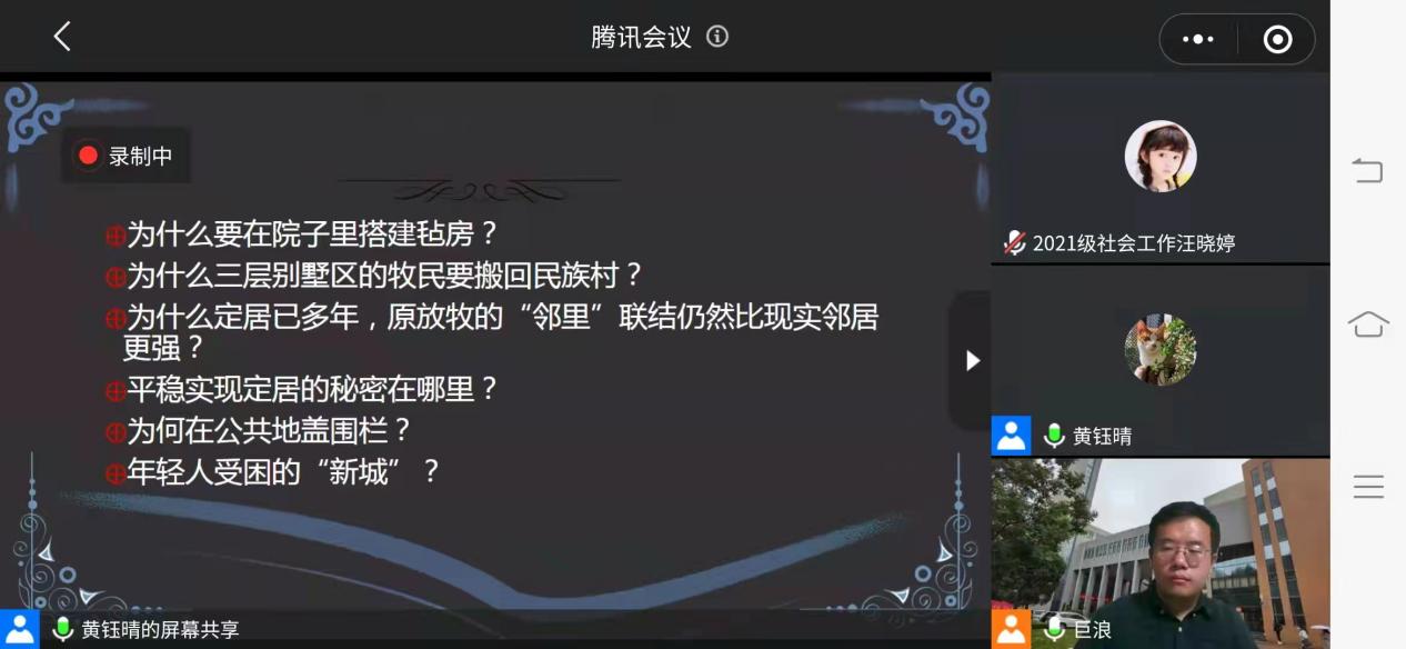 首先,黄钰晴老师带领全院师生了解阿克塞,明确田野点选择的缘由。讲述了自己跟随项目初次遇见阿克塞,以及后来做纪录片重返阿克塞的所见所闻。同学们了解到哈萨克族牧民的风俗习惯和热情的待客礼仪,也看到了黄钰晴老师从最初的志愿者到现代角色“摄影师”的蜕变。