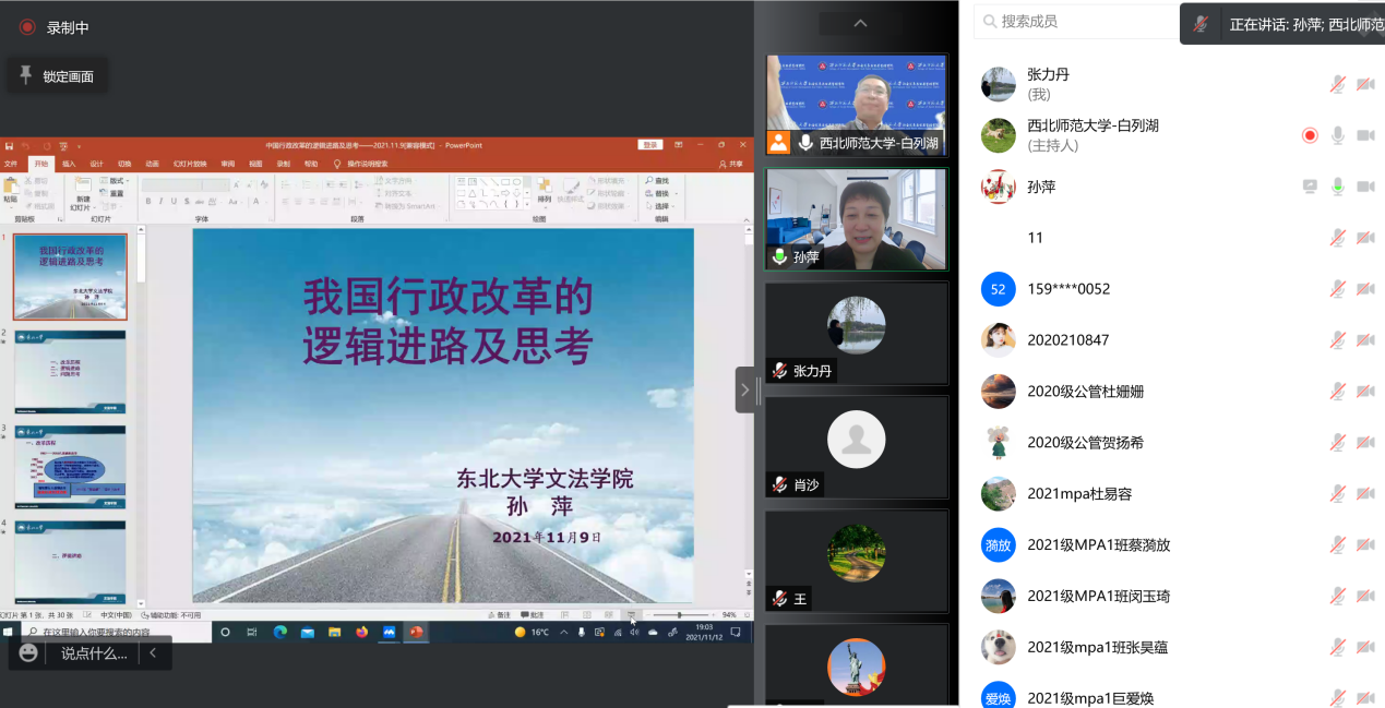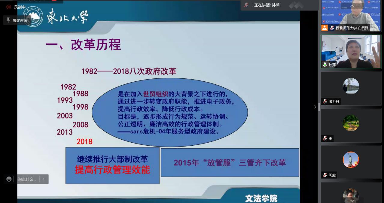 2021年11月12日晚,应鲸鱼直播 邀请,东北大学孙萍教授在线为鲸鱼体育直播 师生作学术报告。报告题目为“我国行政管理改革的逻辑进路与问题思考”。鲸鱼直播 教师、研究生、本科生约300多人参加了本次学术报告。报告由鲸鱼体育直播 白列湖副教授主持,由张文礼教授评议。