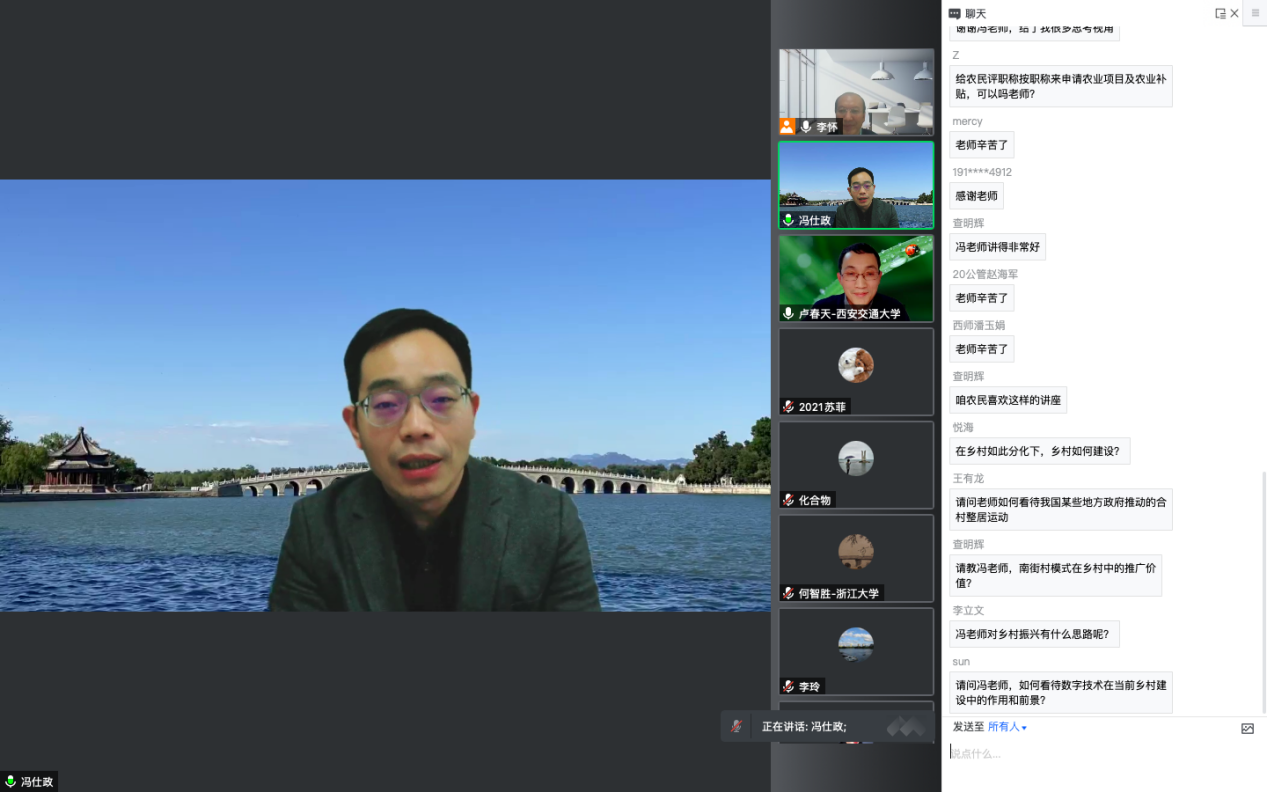 互动环节,诸位师生踊跃提问,冯老师一一进行解答。他深入解释了乡村振兴与乡村建设的联系和区别以及市民化与国民化的差异等问题,受到了师生的一致好评。本次讲座在线人次达到500多人,有力宣传了我校社会学学科建设事业。