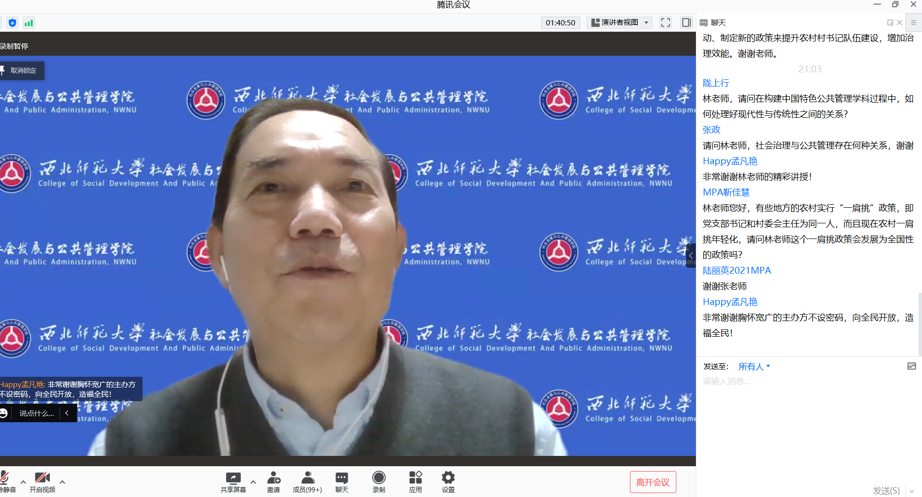 在答疑讨论阶段,林闽钢教授同鲸鱼体育直播 学生进行了精彩的问答互动。高克凡同学提出,“当前农村村书记选拔机制(比如限制年龄、限制户口)等方面是否影响了我国的治理效能,面对现在乡村治理现状,如何采取新的行动、制定新的政策来提升农村村书记队伍建设,增加治理效能”。这个问题引发了参会学生的广泛思考,大家在听了林教授的解答以后也积极提出自己的见解,线上讲座浓厚的学术氛围让林教授更加期待能够亲自来兰州与西北师范大学师生进行一次面对面的学术交流。最后,张文礼教授代表西北师范大学全体师生感谢林教授的精彩分享,为大家贡献了一场丰富的学术盛宴。