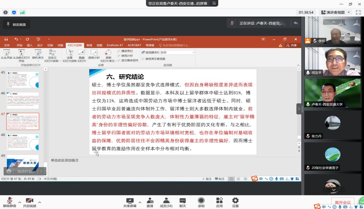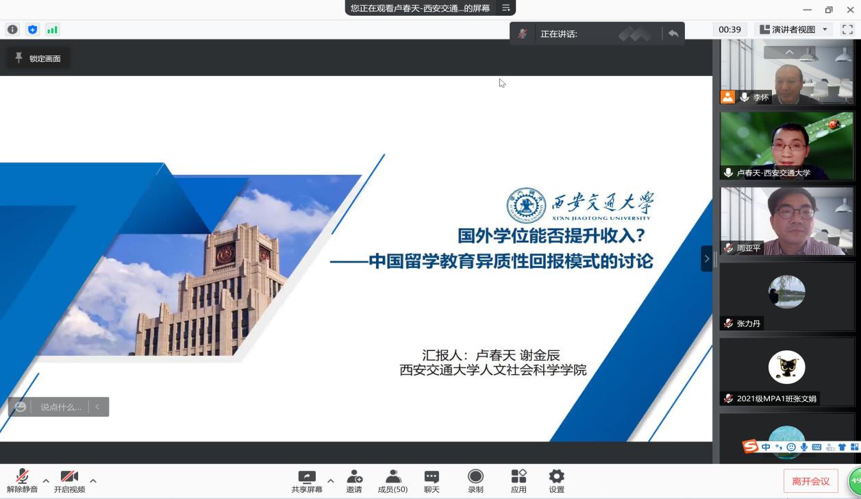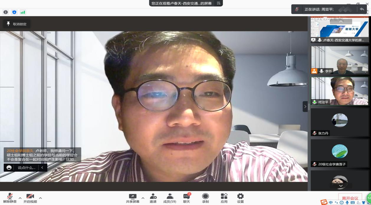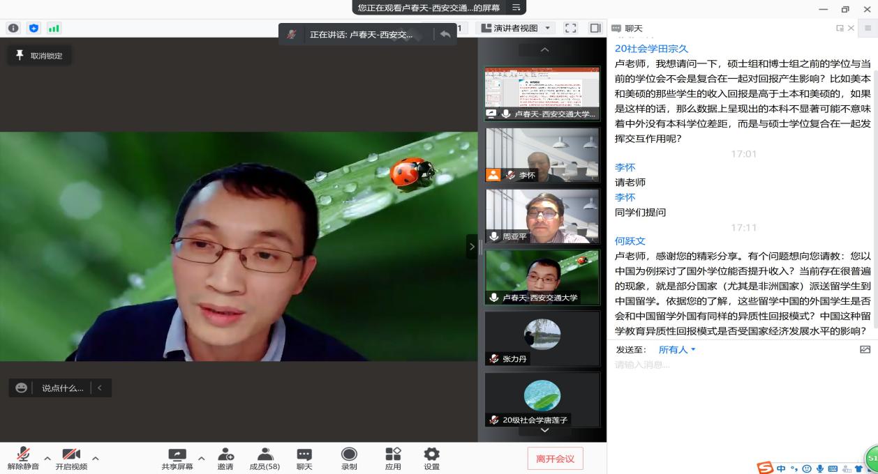 2021年12月2日下午,应鲸鱼体育直播 邀请,西安交通大学社会学系教授卢春天在腾讯会议上为鲸鱼体育直播 师生带来一场名为“国外学位能否提升收入?——中国留学教育异质性回报模式的探讨”的学术讲座。社会发展与公共管理鲸鱼直播 部分研究生在线参加。本次讲座由李怀教授担任主持人,兰州大学周亚平教授担任与谈人。