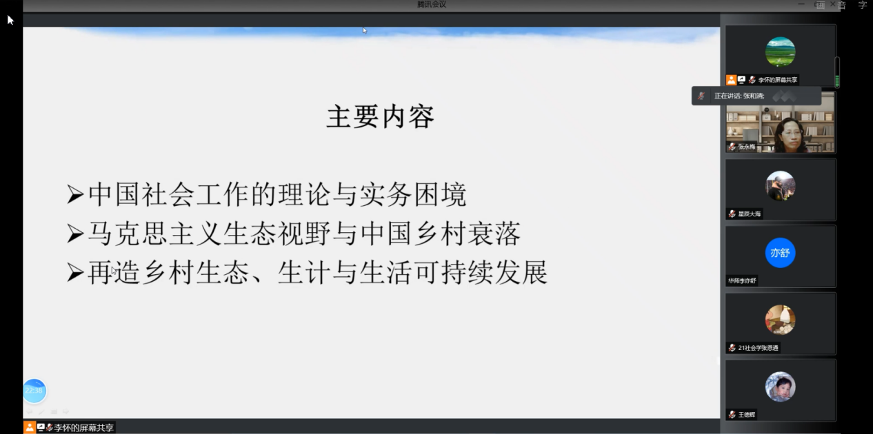 首先,张老师提出问题缘起,在云南绿寨少数民族村落中村民的生计困难与村落的生态破坏以及汶川雅安、青海玉树、广东茂名和云南鲁甸的灾害社会工作实践和调研中,引发对乡村社区生态、生计和生活脆弱性的忧虑。社会工作实务面对此种情况,既无力回应社区民众的民生问题,也无法应对人与环境相互侵害的生态议题。张老师分析其原因在于社会工作面临着理论与实务的双重困境,在反思前两种社会工作理论范式及实务模式局限性的基础上,张老师开始运用马克思主义生态视野分析乡村衰落的现状及其社会根源,并探寻生态社会主义的出路。