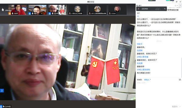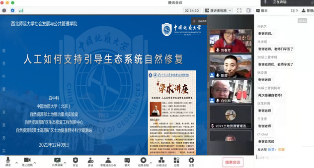 互动环节,与谈人陈英老师做了总结并提出问题。“国土综合”与“国土修复”两个概念是否有明确区别和生态修复中小群体利益如何保障,白老师回答到,在土地整理及土地开发方面,不同时期内涵不一样,解释也就不同,有时在专业术语上存在二者混淆的情况,需要在日后学术中严谨对待。生态修复并不是破坏少部分人的利益,而是提高绝大部分人的生活幸福感,利用可持续发展理念来实现绿水清山就是金山银山的伟大构想。最后,刘春芳老师对白老师精彩的讲座表示感谢,后续也将进一步加强与白老师的交流和探讨。