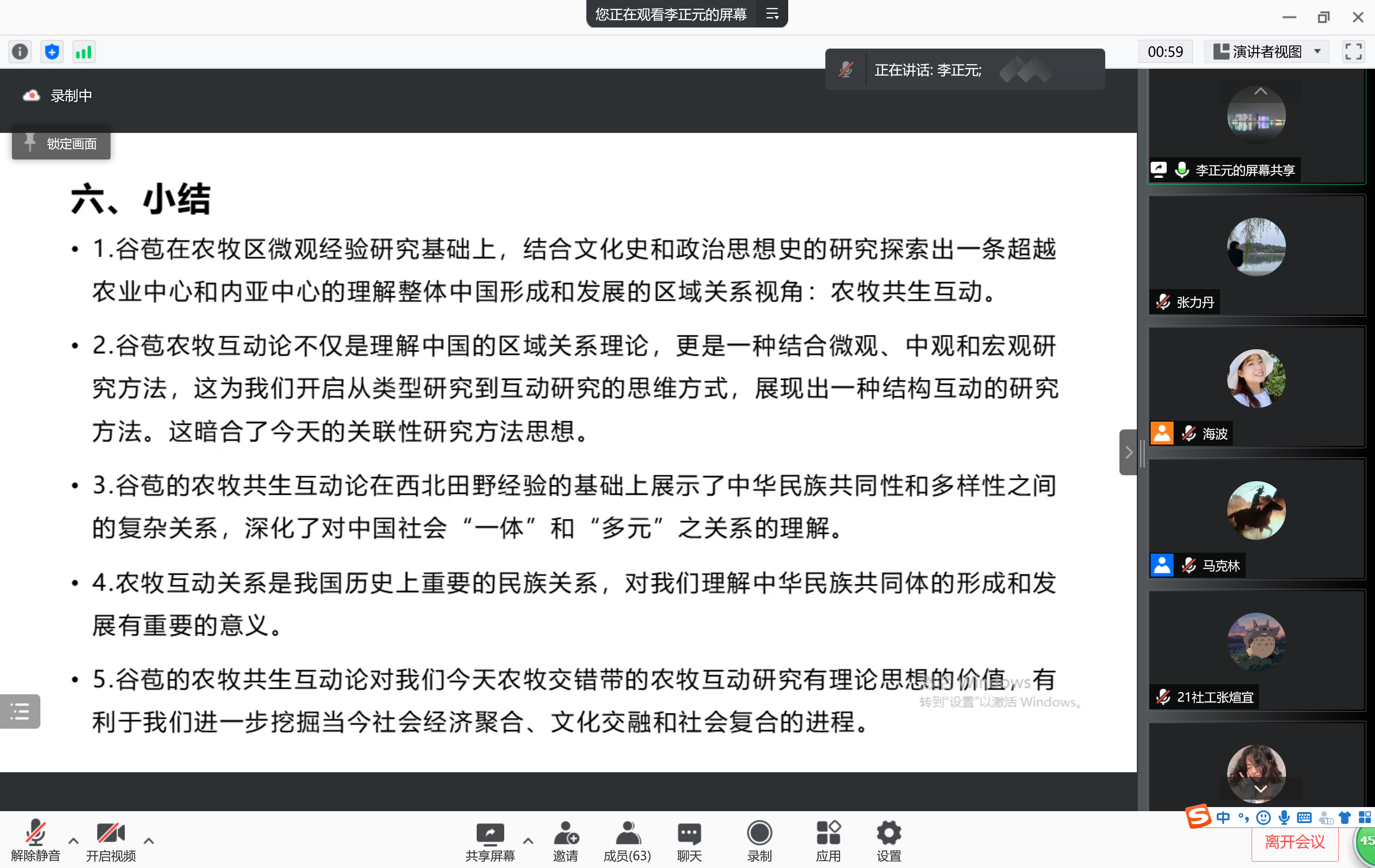 第三部分,李老师提出从迈向区域关系的角度来认识中国。谷苞农牧区位关注到农牧区内部多元性,以及农牧区内在经济社会互动的历史和现实基础其关注区域扩展长城之外所有的农牧区域,同时也不忘挖掘历史上农牧区域互动演变的格局。最后,李老师通过总结谷苞先生在农牧区微观经验研究基础,提出了农牧共生互动概念,这一概念不仅是理解中国区域关系理论,更是一种结合微观、中观和宏观的研究办法。对我们理解中华民族共同体的形成和发展有重要的意义。
