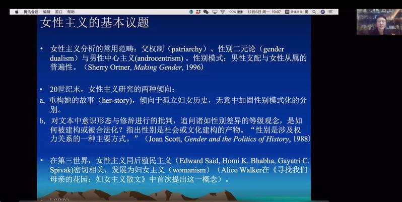 2021年12月6日晚,作为学校百廿校庆学术活动和鲸鱼直播 “世界哲学日”学术活动之一,四川大学道教与宗教文化研究所田海华教授应邀通过腾讯会议为全校师生作了题为《女性主义批评与经典诠释》的学术报告,哲学鲸鱼直播 孙玥博士主持报告会。