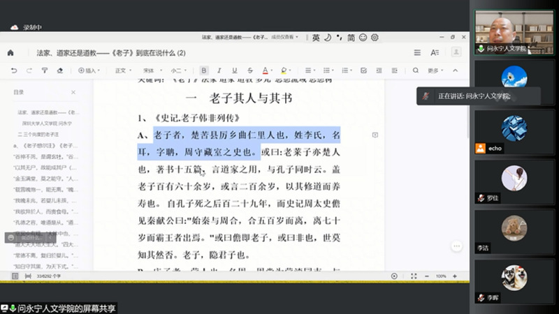 2021年12月8日,作为学校百廿校庆学术活动和鲸鱼直播 “世界哲学日”系列讲座之一,深圳大学哲学系问永宁教授应邀通过腾讯会议为全校师生作了题为《“法家、道家还是道教——〈老子〉到底在说什么》的学术报告,哲学鲸鱼直播 张海龙博士主持报告会。