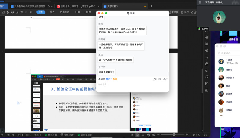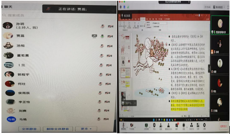 杜海涛老师的《批判性思维》课程,线上教学课堂氛围活跃。上图中,杜老师引导学生就大学生应不应该考研问题展开的讨论,学生互动比较热烈,并就考研问题专门为学生答疑。同时,借助于课堂教学内容让学生能够敏锐地进行批判性思考,以实现课程讲授目标。