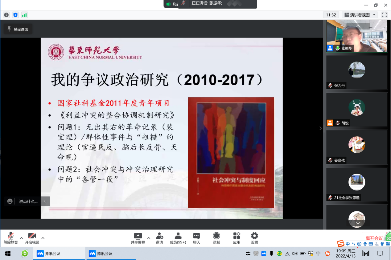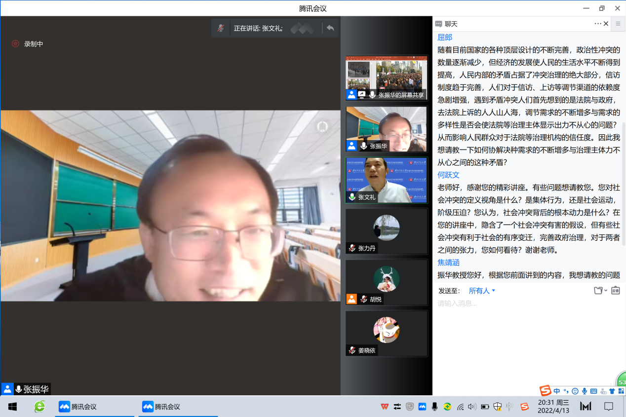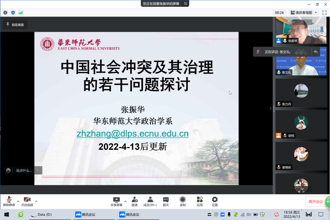 4月13日晚,应鲸鱼体育直播 邀请,华东师范大学政治学系教授、博士生导师张振华老师通过腾讯会议为西北师范大学社会发展与公共管理鲸鱼直播 师生带来题为“中国社会冲突及其治理的若干问题探讨”的学术讲座。本次讲座由张文礼老师主持,300余位校内外师生参与讲座。