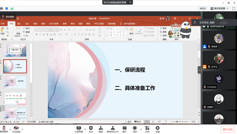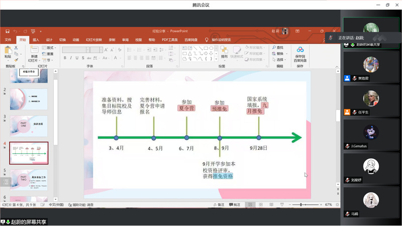 4月21日晚,2022届毕业生赵蔚和常耀方通过腾讯会议进行了分享。赵蔚同学保送至中国人民大学,她详细介绍了参加夏令营的前期准备和注意事项,分享了自己在推免过程中的经验。常耀方同学考入吉林大学,她主要分享了自己在备考过程中总结出的复习要点和调整心态的方式。