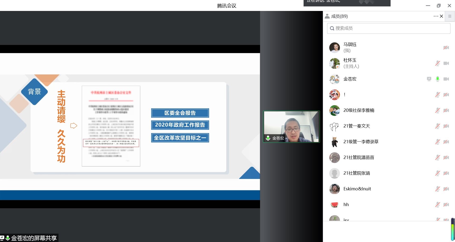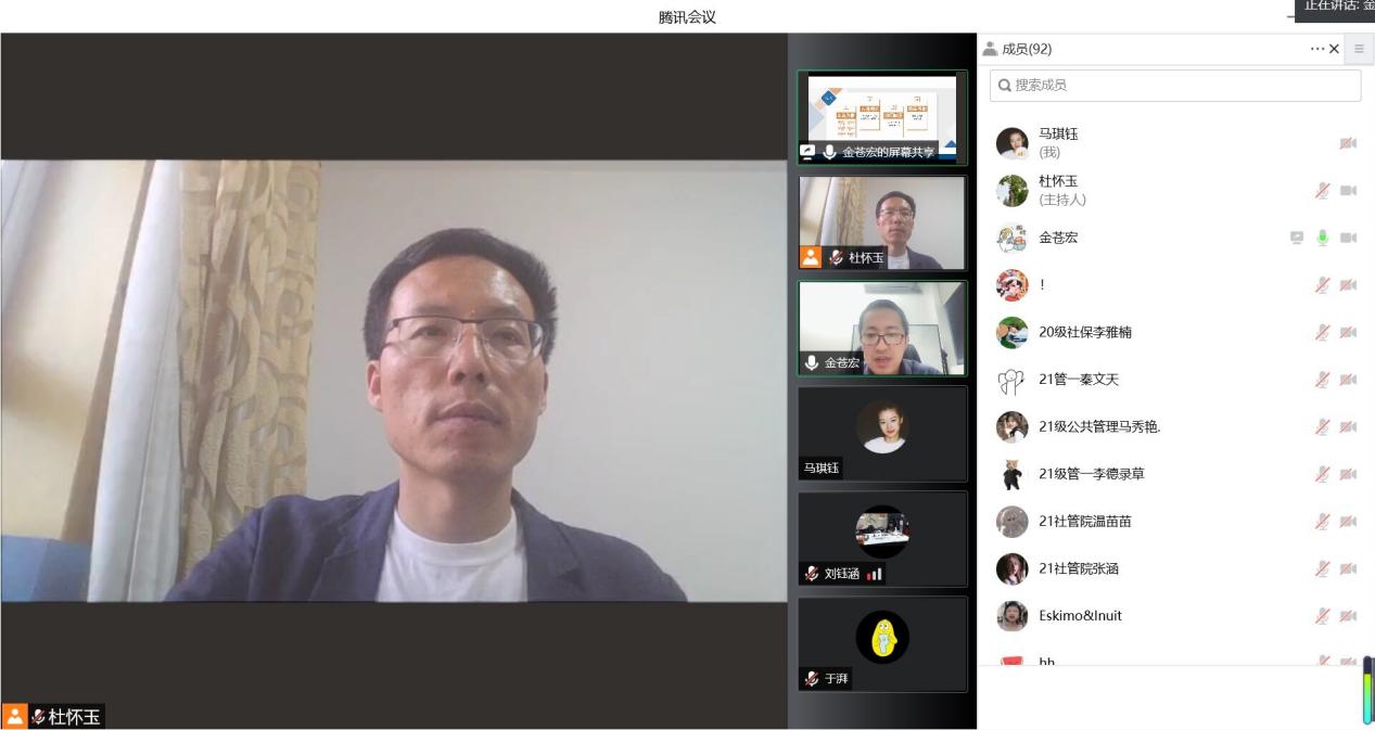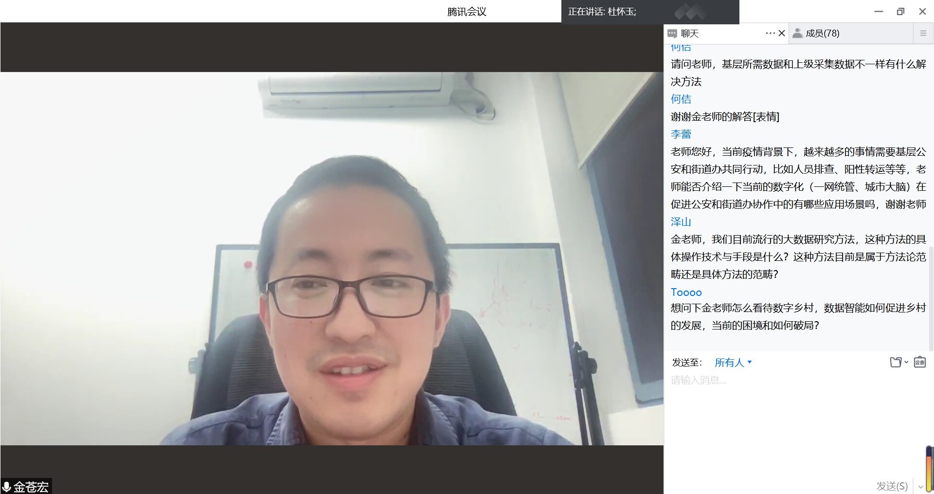 2022年5月12日晚,应鲸鱼体育直播 邀请,浙江大学城市鲸鱼直播 金苍宏副教授在腾讯会议上为鲸鱼体育直播 众师生带来了一场以“数据智能与城市治理”为题的城市数字治理方面的学术讲座。社会发展与公共管理鲸鱼直播 百余名师生在线学习。本次讲座由杜怀玉副教授主持。