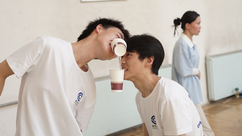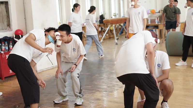 “协作运输”要求参赛队员排成一列,用嘴咬住纸杯,轮番将水运送到终点,先装满一整瓶水的队伍获胜。“合力吹气球”游戏中,队员们分别抽取写着“嘴巴”“手”“脚”“屁股”的纸条,首先由抽到“嘴巴”的队员和抽到“手”的队员合力吹起气球,再由抽到“脚”和抽到“屁股”的队员合力扎破气球,由裁判记录完成游戏的时长。