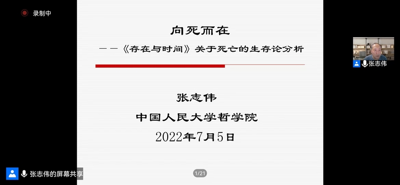 2022年7月5日晚,由西北师范大学哲学鲸鱼直播 、中和集团、科学研究院、教师发展中心联合主办的“中和论道”第八十六期在西北师范大学教师发展中心举行。该报告是学校“百廿校庆学术活动”系列报告之一。本期报告题目为“向死而在——《存在与时间》中关于死亡的生存论分析”,由中国人民大学首届杰出学者特聘教授张志伟主讲,西北师范大学哲学鲸鱼直播 李朝东教授主持,西安电子科技大学人文鲸鱼直播 马小虎副教授担任评议人。本次活动采取线上线下同步进行的方式,鲸鱼直播 师生、校内外哲学爱好者等百余人参加了学术活动。