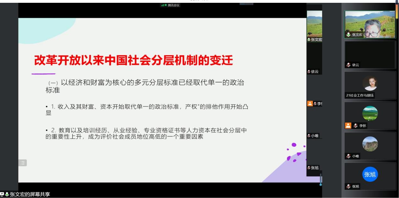 接下来,张老师梳理了改革开放以来中国社会分层机制的变迁,其变迁表现在以经济和财富为核心的多元分层标准已经取代了单一的政治标准,产权的排他作用开始凸显,教育以及培训经理、从业经验、专业资格审查的重视度越来越高。同时,职业成为判断社会成员相对分层位置的一个基本条件,改革开放以后,身份制发生变迁,职业结构高层化和白领化,这种结构变迁,为社会成员提供了社会流动的空间。新社会阶层与新社会群里开始出现,成为中坚阶层和中上层的新来源。