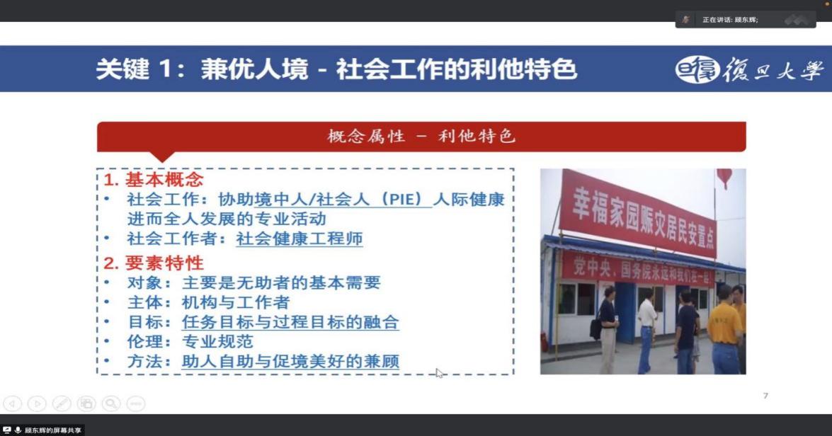 接下来,顾老师首先用马斯洛的人类生理需求、安全需求、归属需求、尊重需求和自我实现五层次理论阐述了社会工作的三项功能,即助人利他、促境(改善社会环境)美好和自我增能。他指出社会工作者在完成任务目标时会生成过程目标,从而在外在显性和内在隐性意义上体现出社会工作的助人利他功能。同时,社会工作也在经济、政治、社会和文化等四重意义上分别表达着人力投资、诉求表达、人境平衡和关助贫弱的优势功能。顾老师提出社会工作是培养综合素质最好的专业之一,社会工作能够兼顾服务对象和宏观环境共同发展,是感知和认识社会的最好专业之一,能帮助学生提升自身的综合素质。