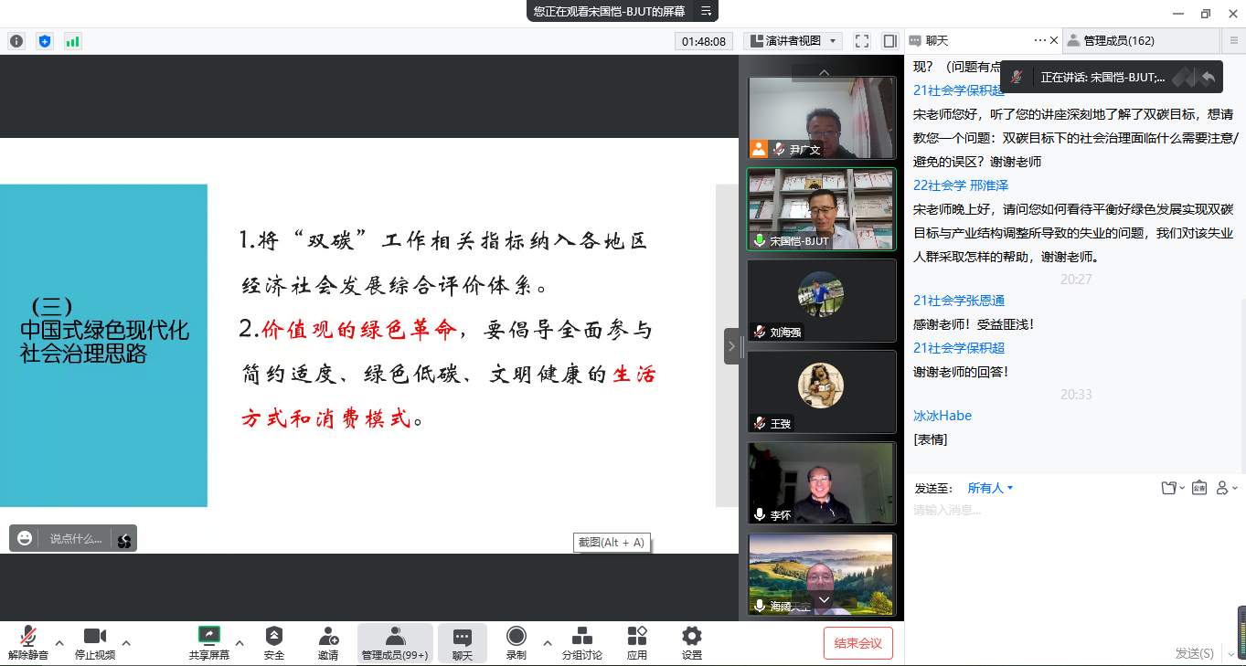 第三个部分,宋老师在以下三个方面阐述了中国式绿色现代化进程中的社会治理。第一个是中国式绿色现代化的内涵,宋老师讲到如果将碳达峰碳中和主题纳入到社会治理还远远不够,应该将其纳入公共管理研究中,同时提到二十大报告中国式现代化中对人与自然和谐共生的理解与阐述,并从六个角度讲述为什么将“双碳”目标纳入到中国式绿色现代化。第二个是提取七个党的文件中关于社会治理的表述来讲解中国式绿色现代化社会治理的逻辑,进一步理解实现“双碳”目标涉及经济社会发展全过程和各领域,它不但将全面重塑我国的经济结构、能源结构、生产方式和生活方式,同时也是一场价值观的绿色革命。第三个是中国式绿色现代化社会治理思路,包括以下六个方面:一是将“双碳”工作相关指标纳入各地区经济社会发展综合评价体系,二是价值观的绿色革命,要倡导全面参与、简约适度、绿色低碳、文明健康的生活方式和消费模式,三是地方适应性治理,四是重点领域中目标治理,五是科技支撑,六是构建低碳治理体系。