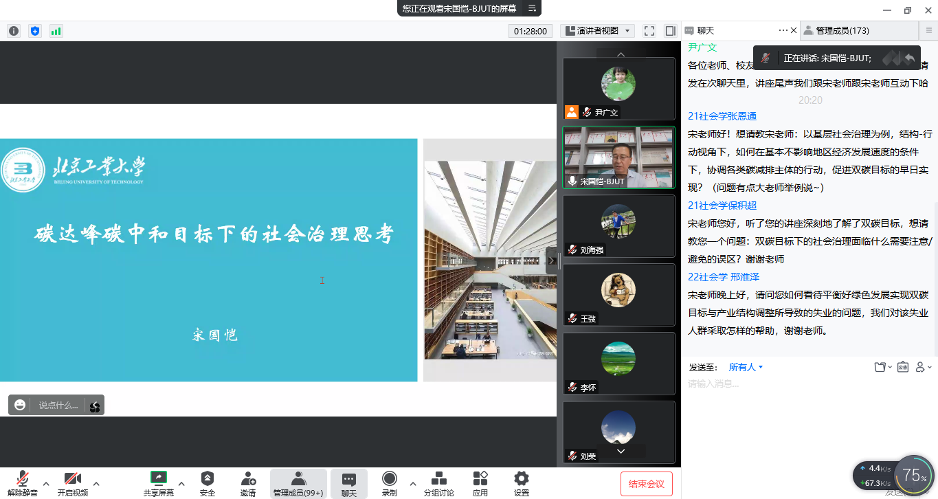 师生作题为“碳达峰碳中和目标下的社会治理思路”的学术讲座。本次讲座由尹广文副教授主持,孙特生教授作评议人,两百多名师生参加。