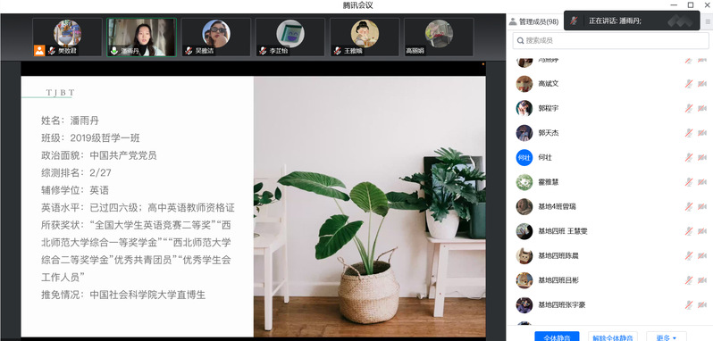 潘雨丹同学获得中国社会科鲸鱼直播 大学直博资格,曾任鲸鱼直播 学生会负责人。在校期间学习成绩优异,曾获“全国大学生英语竞赛二等奖”“西北师范大学综合一等奖学金”“西北师范大学综合二等奖学金”“优秀共青团员”“优秀学生会工作人员”等荣誉称号。