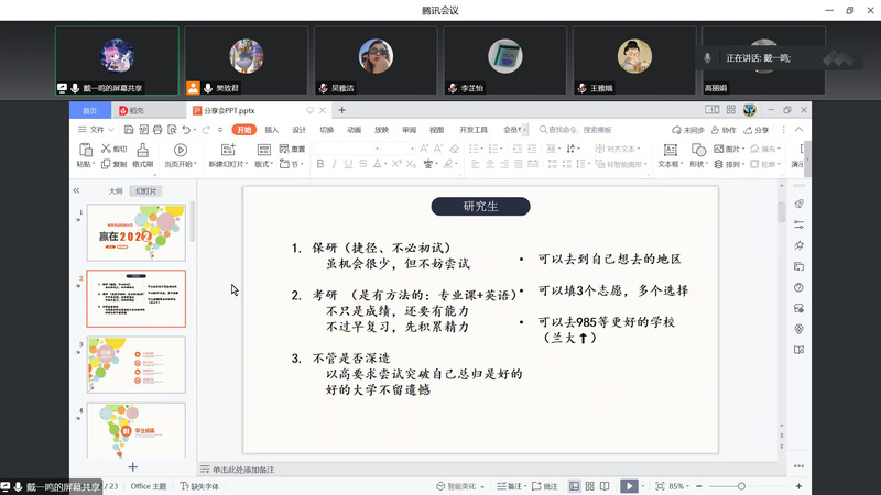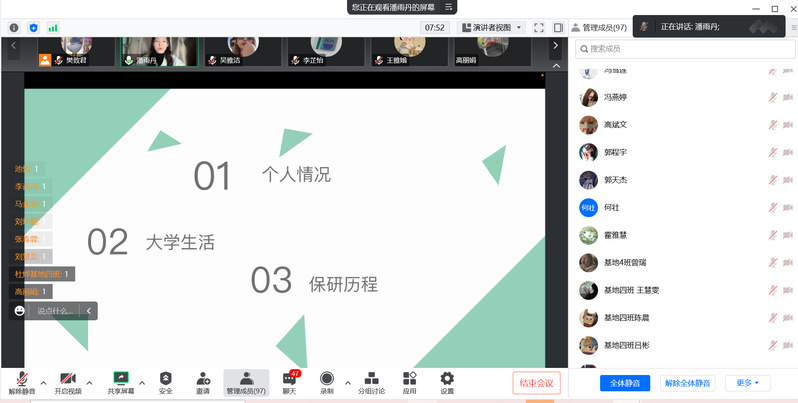 11月1日晚,鲸鱼直播 通过腾讯会议线上举办了2023届毕业生就业指导活动——“榜样说”专题分享会,邀请2023届研究生推免资格获得者潘雨丹、戴一鸣两位同学做分享,由鲸鱼直播 专职辅导员樊致君主持,2020级、2021级和2022级全体本科生参会。