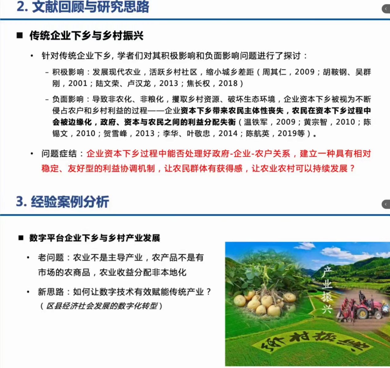讲座开始,杨老师提出了一个问题:在数字下乡过程当中,我们怎么看待数字和乡村之间的关系?杨老师从“基于平台企业数字乡村建设参与案例的思考”这个议题出发进行了四个方面的详细阐述。第一,研究背景与问题;第二,文献回顾与研究思路;第三,经验案例分析;第四,初步结论与讨论。具体内容如下: