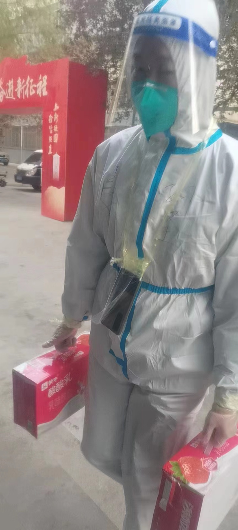 辅导员樊致君于本月3日凌晨接到通知后立即返回兰天公寓投入工作,担任14号楼楼长。主要负责与专班各部门对接、协调楼内学生用餐用水、核酸检测和特殊情况处置等工作,此外,每日登记学生急需的生活用品和药品,为学生提供贴心的“上门配送服务”。她说:“辅导员是学生在校日常生活中最熟悉的人,疫情当前,我们必须、也必然要跟学生站在一起,特殊时期我们将保持高涨的工作状态,扎实做好保障服务工作,让学生吃饱每一顿饭、上好每一堂课,解决好学生生活上的每一个问题。”