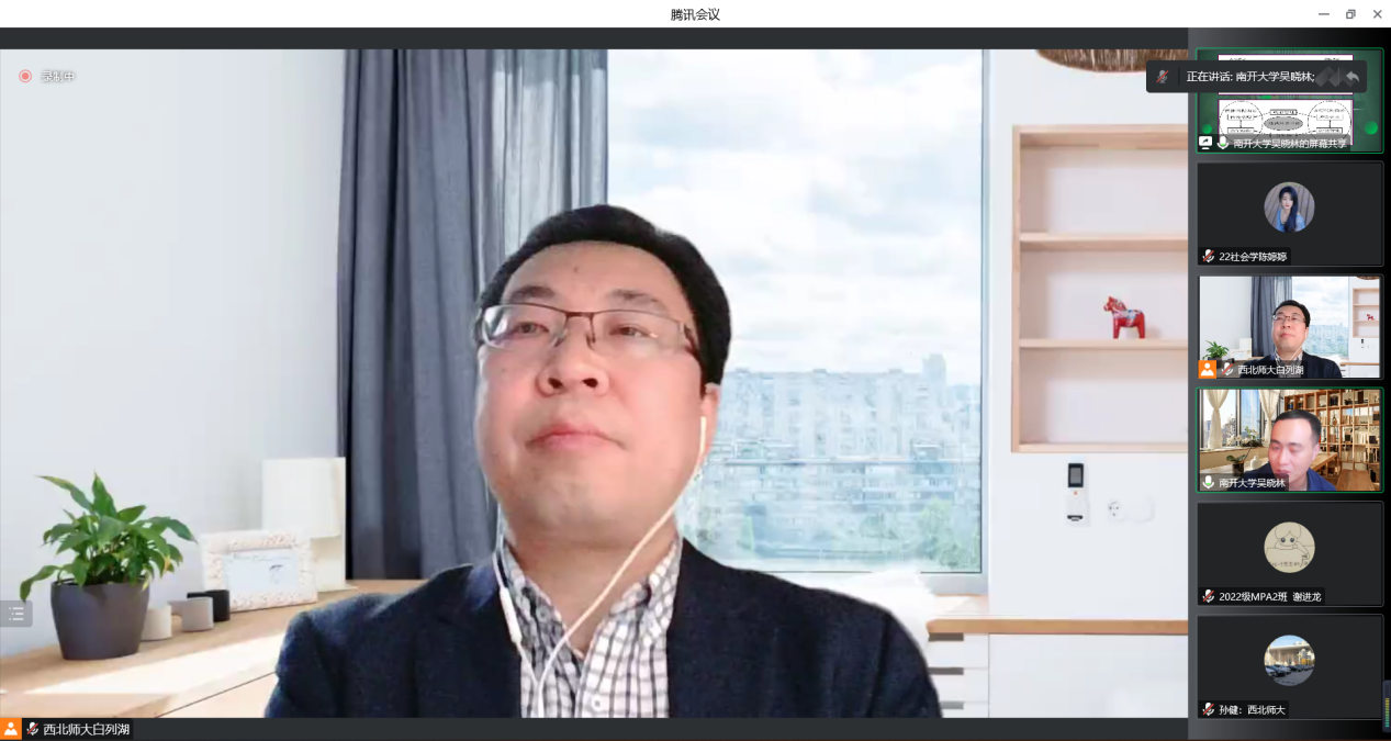 2022年11月18日19时,恰逢西北师范大学建校120周年庆暨社会发展与公共管理鲸鱼直播 建院十周年庆举办系列学术讲座活动之际,南开大学周恩来政府管理鲸鱼直播 副院长吴晓林教授应邀为鲸鱼体育直播 师生在线上作了题为”城市基层治理研究的田野方法”的学术讲座。本次讲座由鲸鱼直播 MPA中心执行主任白列湖副教授主持,鲸鱼直播 共计200多名师生参加了此次讲座。