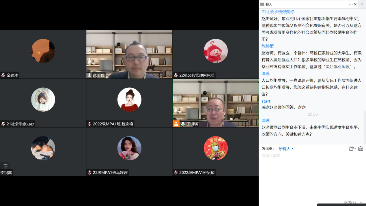 鲸鱼体育直播 师生与赵老师进行了积极互动,同学们对中国人口结构变化与当代青年发展及相关问题提出了疑问,赵老师做出了耐心解答。互动环节结束后,王琪瑛老师总结了自己学习的心得。第一,讲座涵盖了人口学的许多问题领域,每一个部分都可以作为学术选题进行深入分析;第二,讲座不仅对人口学基本理论和方法进行了回顾,并对低生育陷阱、青年社会融合、人口塌陷、人口预测和人口均衡发展理论等学术热点问题贡献了真知灼见。第三,在学术研究中,必须高度重视青年问题的研究。同时,王老师结合自己的体验,讲到如何做一名合格的研究生。希望同学们在问题领域、理论视角和研究方法、技术等层面做好学术训练。讲座尾声,王老师对赵老师的精彩演讲表达了衷心的感谢并诚挚邀请赵老师在疫情结束后来西北师范大学做线下讲座,进行更深入的学术交流与探讨。