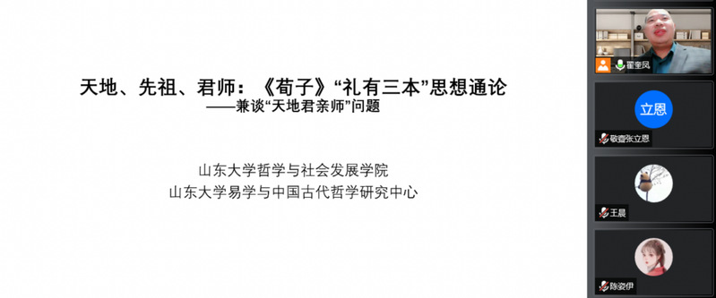 10月27日下午,山东大学儒学高等研究院教授、博士生导师翟奎凤应邀通过线上会议的形式为鲸鱼体育直播 师生作了题为“天地、先祖、君师:《荀子》‘礼有三本’思想通论——兼谈‘天地君亲师’问题”的学术报告。哲学鲸鱼直播 张立恩副教授主持报告会,校内外师生百余人参加此次学术报告会。