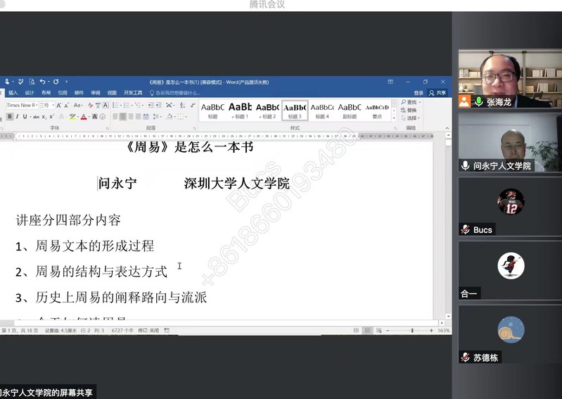 2022年11月26日晚,应西北师范大学哲学鲸鱼直播 邀请,深圳大学人文鲸鱼直播 问永宁教授在线为全校师生做了题为“《周易》是怎样一本书?”的学术报告。哲学鲸鱼直播 张海龙讲师主持报告会,鲸鱼直播 师生及校内外哲学爱好者百余人参加此次学术报告会。