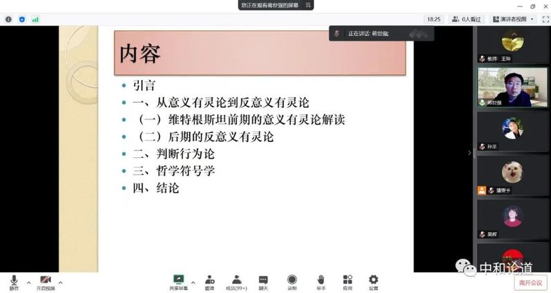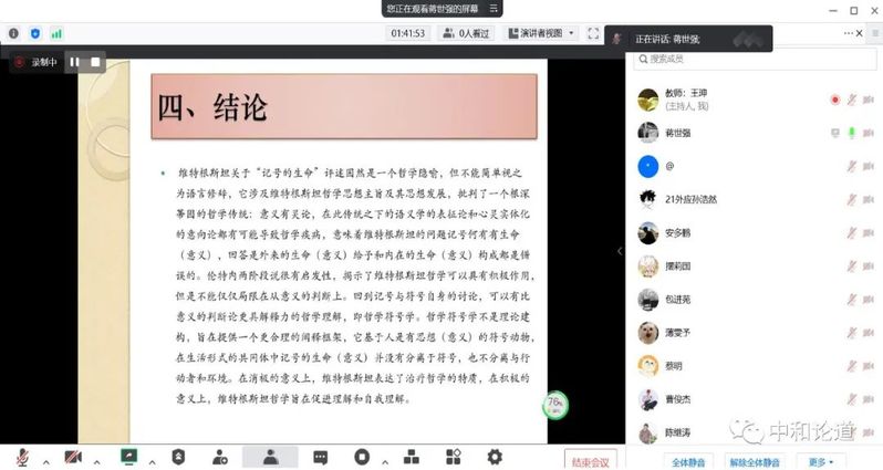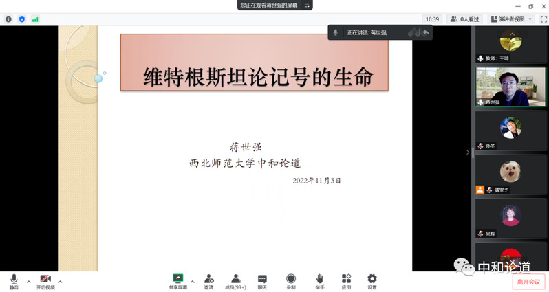2022年11月3日晚,“中和论道”第88期“维特根斯坦论记号的生命”在线上如期举行。本期讲座由西北师范大学哲学鲸鱼直播 、中和集团、科学研究院、教师发展中心联合主办,是学校“百廿校庆学术活动”系列报告之一。讲座邀请西北师范大学外国语鲸鱼直播 蒋世强副教授作为主讲嘉宾,西北师范大学哲学鲸鱼直播 孙圣副教授作为与谈嘉宾,讲座由哲学鲸鱼直播 王珅副教授主持。校内外的众多哲学爱好者等140余人参加了此次讲座。