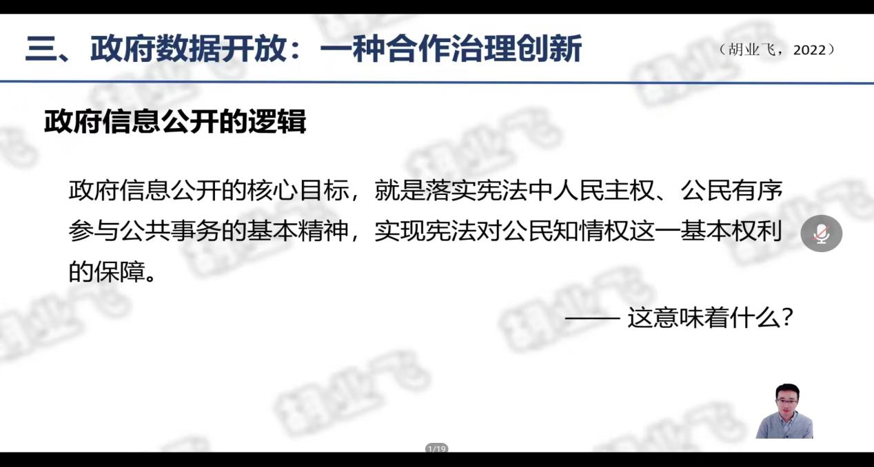 2022年12月15日19时,正值学校百廿校庆暨鲸鱼直播 建院十周年院庆举行学术论坛系列学术讲座活动之际,应鲸鱼直播 邀请,复旦大学国际关系与公共事务鲸鱼直播 胡业飞副教授莅临云端,在线为鲸鱼体育直播 师生作了题为“政府数据开放的逻辑”的学术讲座。本次讲座由王婷老师主持,鲸鱼直播 200多名师生参加了此次讲座。