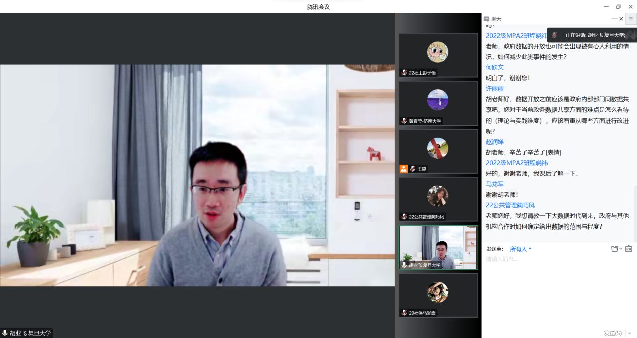 讲座尾声,胡老师与鲸鱼体育直播 师生进行了热烈地交流与讨论,并针对鲸鱼直播 师生们提出的问题进行了认真回应。在讨论中,胡老师指出数据共享和数据开放是两个方向,共享的核心是协调的难度,而数据和信息的联系是数据是信息的载体。然后针对本次讲座,王老师向胡老师表达了感谢,并结合自己的体会对本场讲座作了最后总结,王老师指出胡老师从“老年人与诈骗”这一鲜活案例入手,以大数据时代的到临、数据的要素化、政府数据开放:一种合作治理创新这一主线,剥开了政府数据开放的底层逻辑。这样的形式使得本次讲座既轻松又有趣。王老师还指出胡老师不仅对研究问题具有自己的学术思想和理论探讨,而且胡老师对于研究现实热点及难点问题的路径逻辑,值得我们师生共同学习和共同探讨。