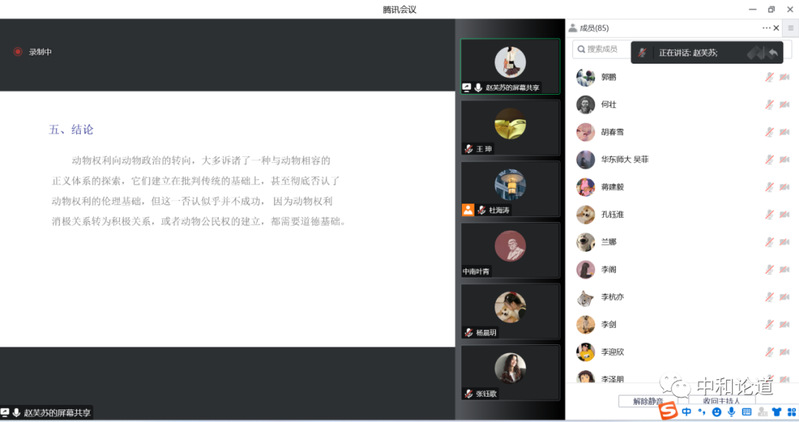 关于动物权利关系的转变,赵芙苏博士基于苏·唐纳森与威尔·金里卡合著的《动物社群》一书,对消极权利向积极权利的这一转变进行了讲解。赵芙苏博士谈到,唐纳森与金里卡提出了三种大致的动物分类来区分其具有的权利,分别为家养动物、野生动物与边缘动物,而其所对应的权利分别为为公民权、主权与居民权。二人建立“人-动物政治共同体”是提出的消极权利转变之后的人与动物的关系构建,然而随着人类社会的发展和形态更替,动物参与到人类社会的功能却几乎没有更多扩展,由此赵芙苏博士开启了关于权利主体扩展的话题。