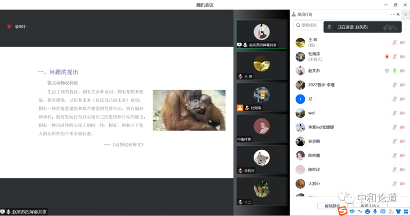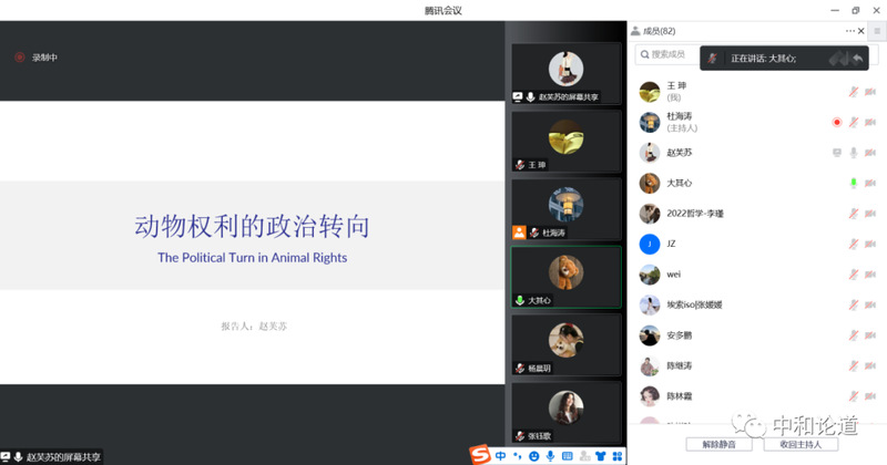 2022年12月27日,由西北师范大学哲学鲸鱼直播 、中和集团、科学研究院、教师发展中心联合主办的“中和论道”第93期在线上如期举行。本期讲座主题为“动物权利的政治转向”,讲座邀请西北师范大学哲学鲸鱼直播 赵芙苏博士主讲,杜海涛博士主持讲座,任万明副教授作为与谈嘉宾参加讲座与交流。