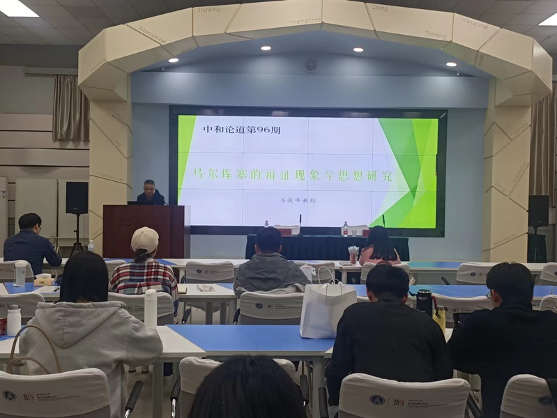 2023年5月11日晚,由西北师范大学哲学鲸鱼直播 、中和集团、科学研究院、教师发展中心联合主办的“中和论道”第96期在教师发展中心二楼报告厅举行。本期讲座的主题为《马尔库塞的辩证现象学思想研究》,主讲嘉宾为西北师范大学马克思主义鲸鱼直播 副院长马俊峰教授,与谈嘉宾为哲学鲸鱼直播 朱海斌副教授,哲学鲸鱼直播 王珅副教授主持。