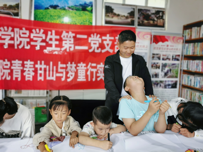 实践活动开始前,队员们号召全院学生开展了“好伙伴共成长”募捐活动,收到了同学们向甘山村的孩子们捐赠的图书和玩偶。实践期间,队员们组织了一系列趣味游戏与孩子们互动,开展了“未来的甘山”绘画比赛。孩子们纷纷拿起画笔,一笔一划地描绘着心目中美好的家乡,比赛结束后实践团也为孩子们送上了书包、台灯、钢笔等奖品。此外,学生第二党支部的党员也为孩子们精心准备了一节党课,向孩子们介绍了国旗、党旗和团旗等小知识。