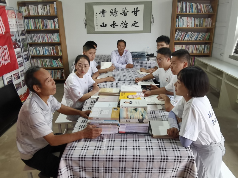 8月17日上午,在村委会的帮助下,实践团邀请了两位老党员在读书室与学生党员一同上党课,互相分享入党经历和学习感悟。老党员们讲起曾在部队和基层入党的经历时,纷纷感慨万千,鼓励队员们珍惜在校时光,努力提升自己、增强干劲。