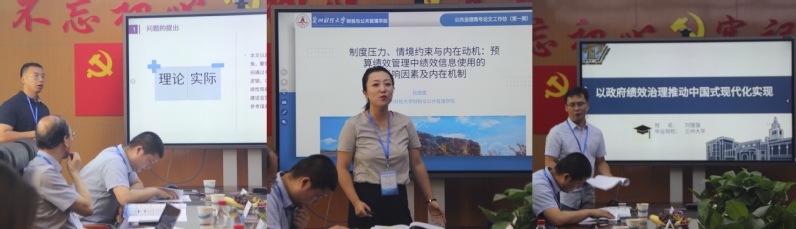 会议上半场,来自清华大学的邢磊博士、兰州财政大学的杜丽娜博士以及兰州大学刘强强博士分别以《策略调试与利益共享:西部地区政府与社会组织合作何以维系?——以C市公共文化服务购买为例》《制度压力、情景约束与内在动机:预算绩效管理中绩效信息使用的影响因素及内在机制》《政府绩效治理助推中国式现代化实现:逻辑框架与机制优化》为题进行了成果汇报,兰州大学刘强强、兰州财经大学杜丽娜博士、清华大学邢磊博士、西北师范大学王蓉娟博士以及兰州大学张振华博士和山东大学张坤鑫博士分别就论文内容进行了与谈与点评。