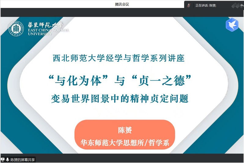 6月14日下午,华东师范大学哲学系教授、博士生导师,教育部人文社会科学重点研究基地华东师范大学中国现代思想文化研究所副所长陈赟教授应邀通过线上会议的形式为鲸鱼体育直播 师生作了题为“‘与化为体’与‘贞一之德’变易世界图景中的精神安顿问题”的学术报告。哲学鲸鱼直播 张立恩教授主持报告会,鲸鱼直播 师生及校内外哲学爱好者百余人参加本次学术报告会。